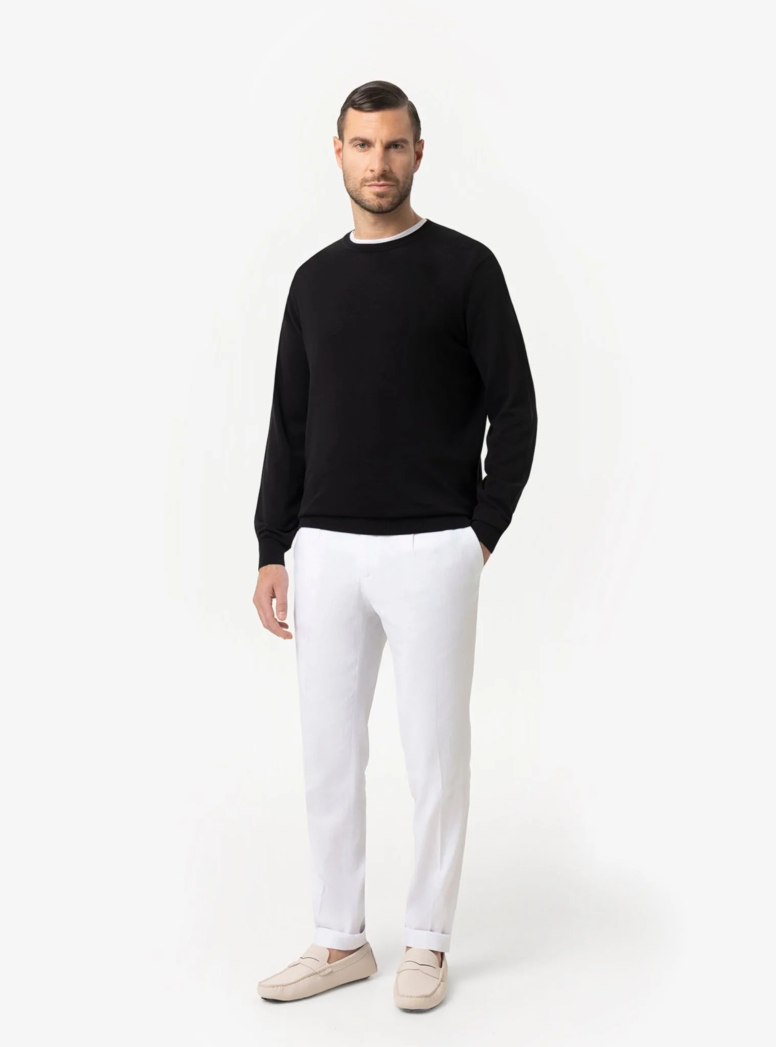 Questo girocollo si distingue per la sua capacità di adattarsi a diverse combinazioni. Indossato con un pantalone chino o con un pantalone sartoriale leggero, crea un equilibrio perfetto tra informalità e ricercatezza. Abbinato a un blazer destrutturato, diventa una valida alternativa alla classica camicia nelle occasioni meno formali, mantenendo comunque un’immagine curata e coerente. Con un denim o un pantalone cinque tasche, esprime invece un’attitudine più rilassata ma sempre ordinata.