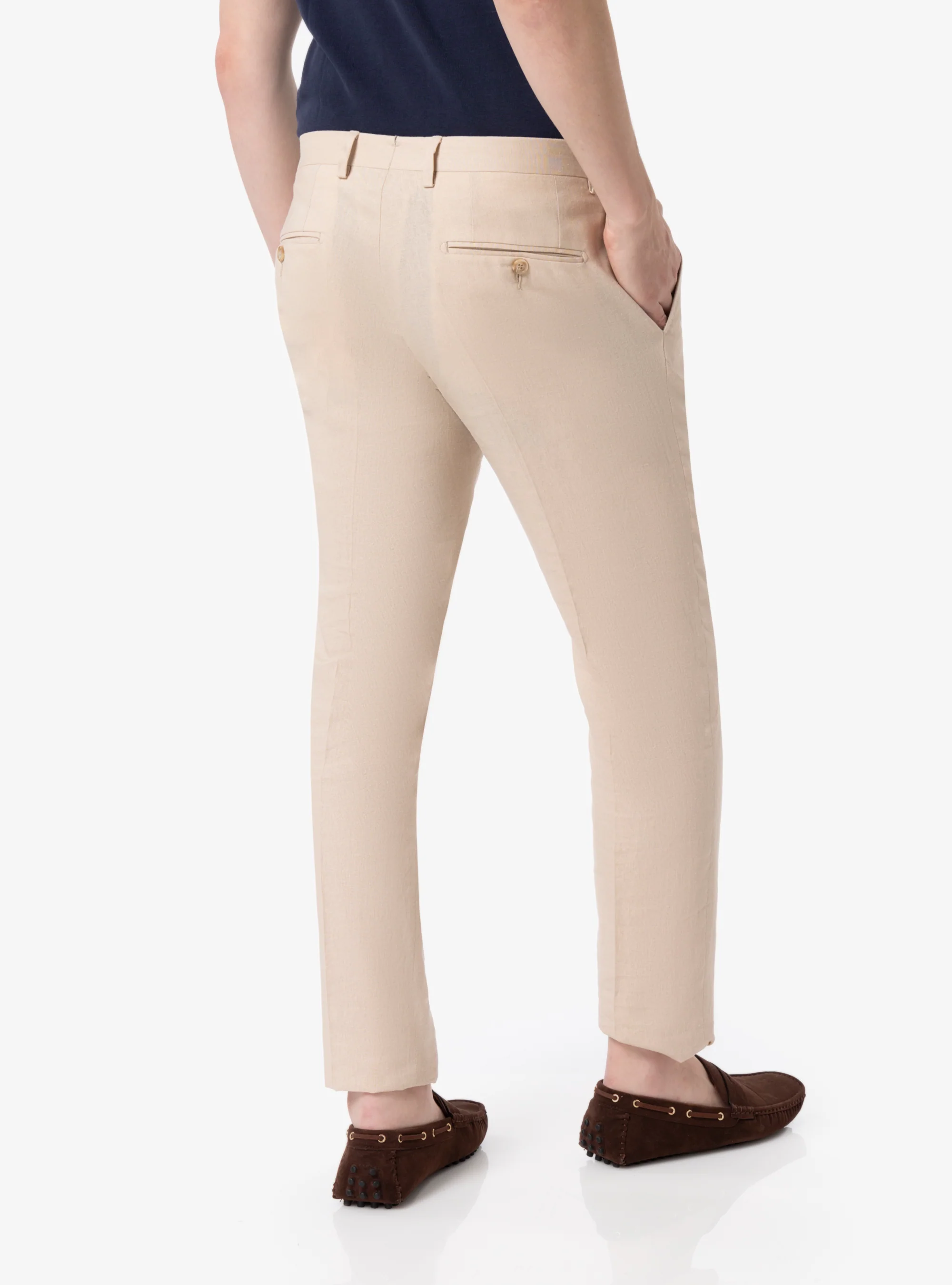 Questi pantaloni, distinti dalle loro pinces eleganti, non solo arricchiscono il design con un tocco classico, ma ottimizzano anche la vestibilità, assicurando più spazio e comodità. Il lino, noto per la sua leggerezza e traspirabilità, mantiene una sensazione di freschezza anche durante le giornate più calde, rendendo il pantalone ideale sia per impegni professionali che per occasioni sociali all'aperto.